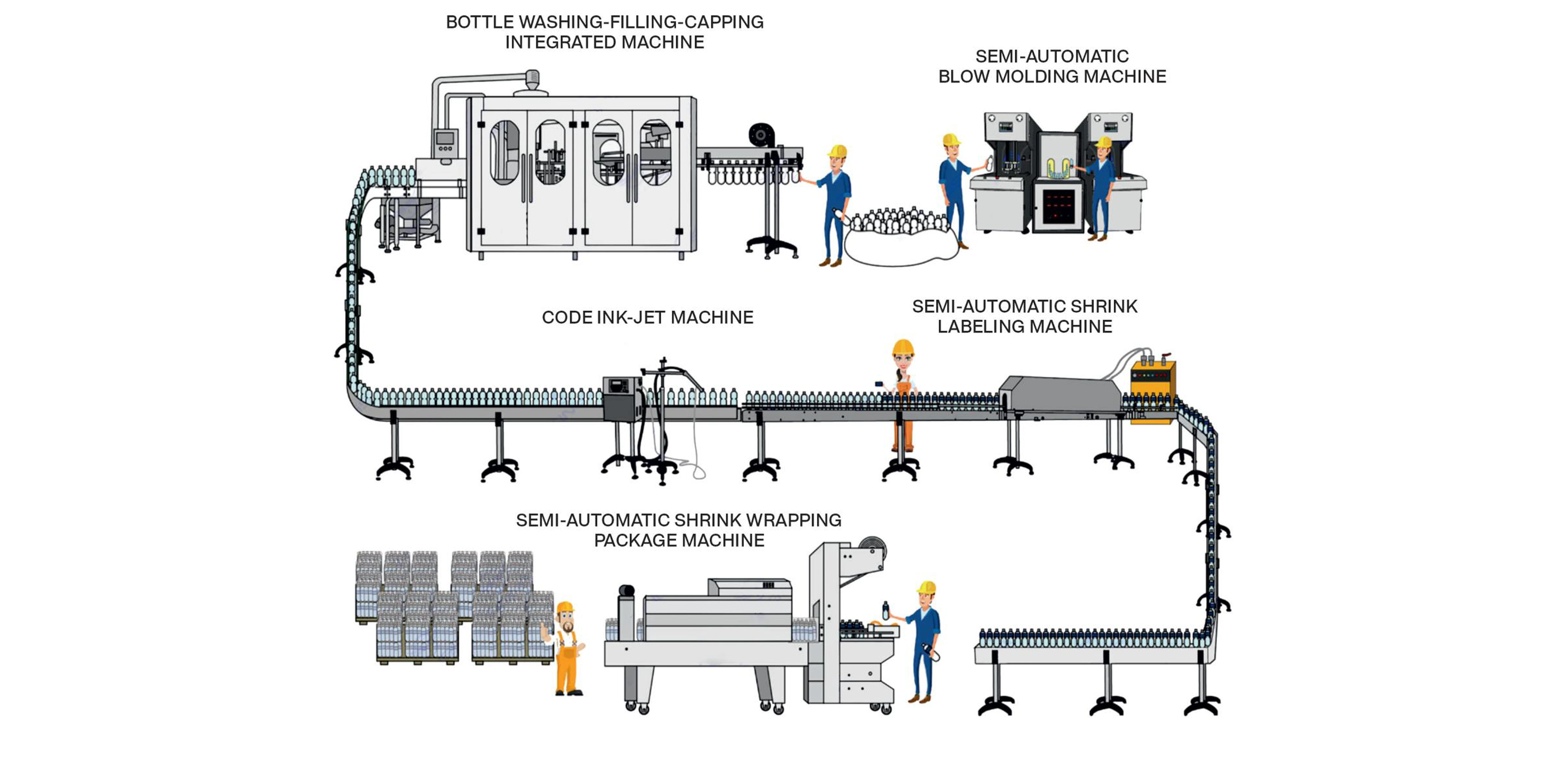 The Production Capacity of A Semi-Automated Mineral Water Plant Depends On The Size Of The Purification System And The Bottle Filling Machine. Common Configurations Include: